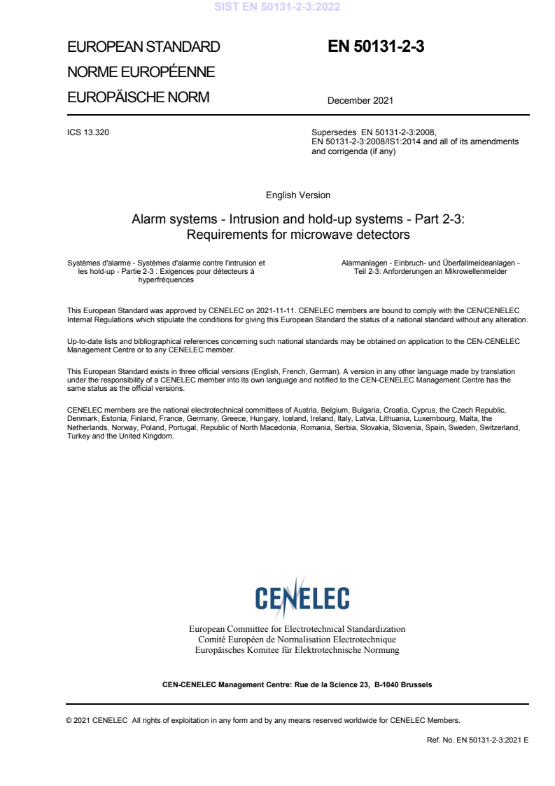 EN 50131-2-3:2021 is a standard published by CLC. Its full title is "Alarm systems - Intrusion and hold-up systems - Part 2-3: Requirements for microwave detectors". This standard covers: This document is for microwave detectors installed in buildings and provides for security grades 1 to 4 (see EN 50131 1), specific or non-specific wired or wire-free detectors, and uses environmental classes I to IV (see EN 50130 5). This document does not include requirements for detectors intended for use outdoors. The purpose of the detector is to emit microwave signals and analyse the signals that are returned to detect an intruder and to provide the necessary range of signals or messages to be used by the rest of the intrusion alarm system. The grade-dependent requirements of this document apply and it is essential that a detector fulfils all the requirements of the specified grade. Functions additional to the mandatory functions specified in this document can be included in the detector, providing they do not influence the correct operation of the mandatory functions. Requirements for system interconnections are not included in this document.