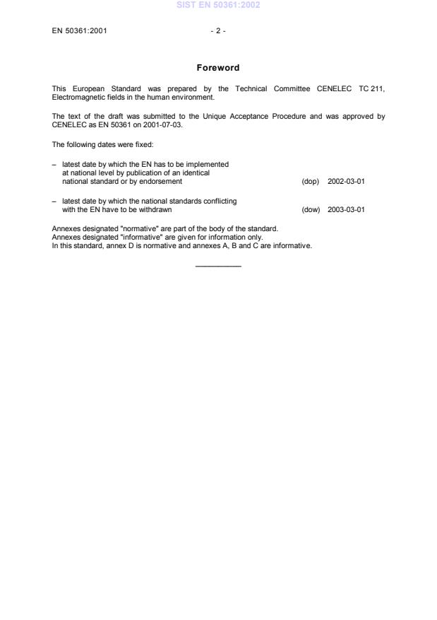 EN 50361:2001 is associated with the following European legislation: Standardization Mandates: M/305. When a standard is cited in the Official Journal of the European Union, products manufactured in conformity with it benefit from a presumption of conformity with the essential requirements of the corresponding EU directive or regulation.