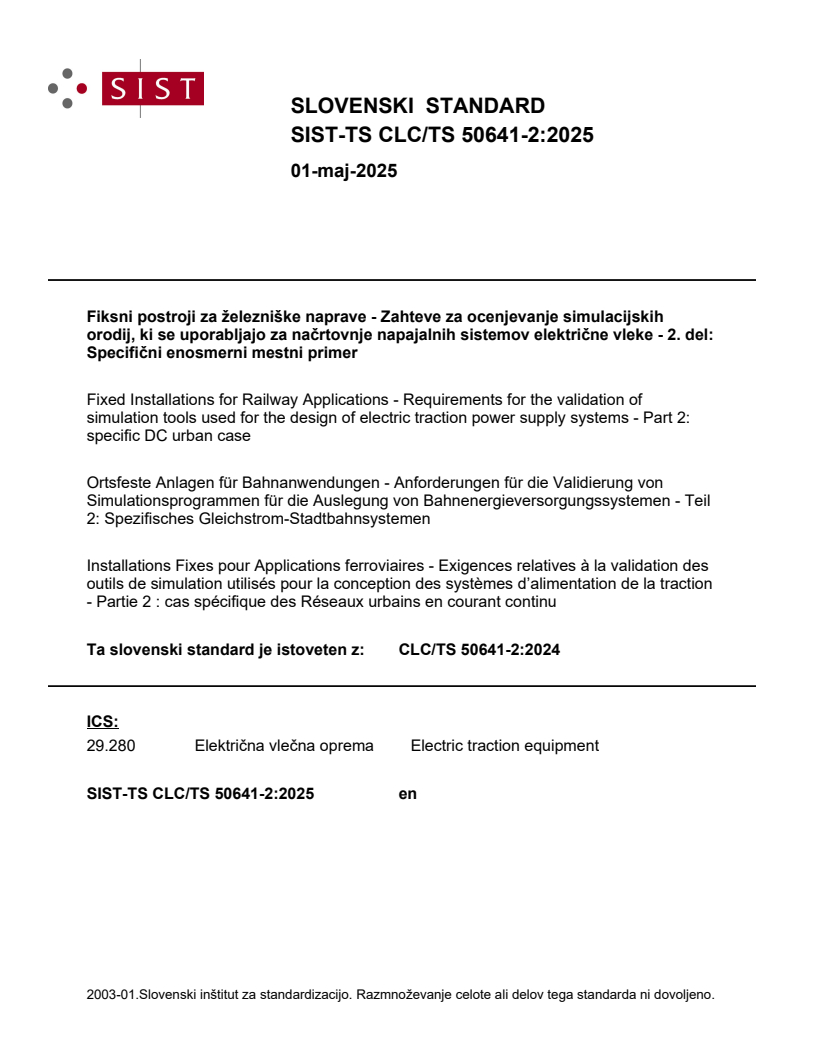 Keywords: CLC/TS 50641-2:2024, simulation tools validation, DC traction power supply, 750 V DC, urban rail, train movement, load flow, tramways, trolleybus, electric traction.