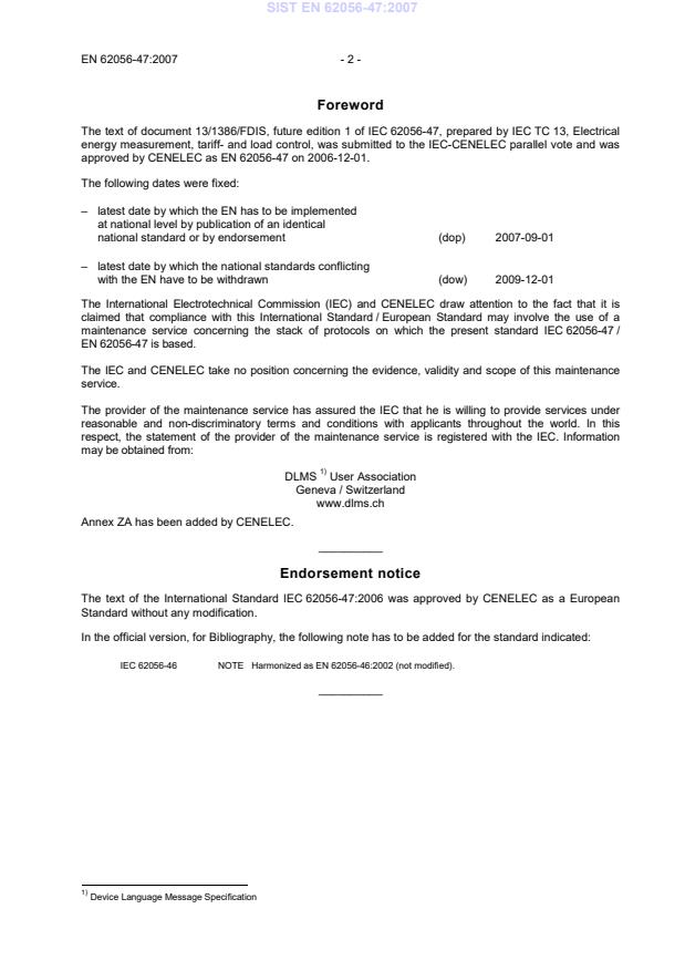 8) Attention is drawn to the Normative references cited in this publication. Use of the referenced publications is indispensable for the correct application of this publication. 9) Attention is drawn to the possibility that some of the elements of this IEC Publication may be the subject of patent rights. IEC shall not be held responsible for identifying any or all such patent rights. The International Electrotechnical Commission (IEC) draws attention to the fact that it is claimed that compliance with this International Standard may involve the use of a maintenance service concerning the stack of protocols on which the present standard IEC 62056-47 is based. The IEC takes no position concerning the evidence, validity and scope of this maintenance service. The provider of the maintenance service has assured the IEC that he is willing to provide services under reasonable and non-discriminatory terms and conditions with applicants throughout the world. In this respect, the statement of the provider of the maintenance service is registered with the IEC. Information may be obtained from: DLMS1 User Association Geneva / Switzerland www.dlms.ch International Standard IEC 62056-47 has been prepared by IEC technical committee 13: Equipment for electrical energy measurement and load control. ——————— 1 Device Language Message Specification SIST EN 62056-47:2007