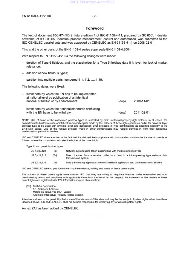 Use of some of the associated protocol types is restricted by their intellectual-property-right holders. In all cases, the commitment to limited release of intellectual-property-rights made by the holders of those rights permits a particular data-link layer protocol type to be used with physical layer and application layer protocols in Type combinations as specified explicitly in the IEC 61784 series. Use of the various protocol types in other combinations may require permission from their respective intellectual-property-right holders. IEC draws attention to the fact that it is claimed that compliance with this standard may involve the use of patents as follows, where the [xx] notation indicates the holder of the patent right: Type 11 and possibly other Types: US 4,930,121 [To] Network system using token-passing bus with multiple priority levels US 5,414,813 [To] Direct transfer from a receive buffer to a host in a token-passing type network data transmission system US 6,711,131 [To] Data transmitting apparatus, network interface apparatus, and data transmitting system IEC takes no position concerning the evidence, validity and scope of these patent rights. The holders of these patent rights have assured IEC that they are willing to negotiate licences under reasonable and non-discriminatory terms and conditions with applicants throughout the world. In this respect, the statement of the holders of these patent rights are registered with IEC. Information may be obtained from: SIST EN 61158-4-11:2008