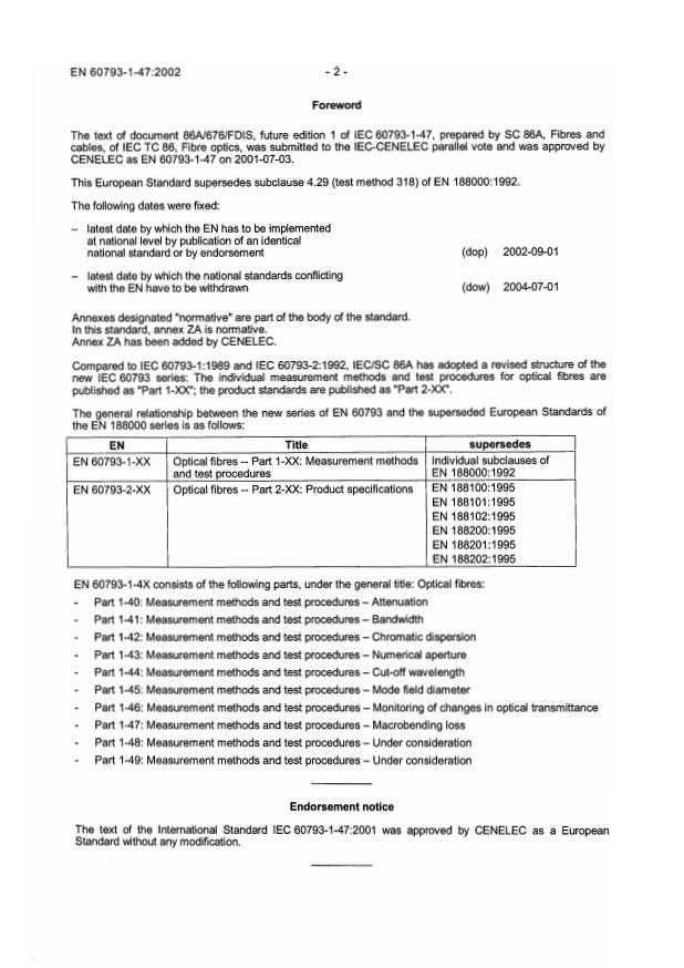 EN 60793-1-47:2002 is a standard published by CLC. Its full title is "Optical fibres - Part 1-47: Measurement methods and test procedures - Macrobending loss". This standard covers: Establishes uniform requirements for measuring macrobending sensitivity for category B1 to B4 single-mode optical fibres at 1550 nm and of category A1 multimode fibres at 850 nm and 1300 nm. The standard gives two methods for measuring macrobending sensitivity: power monitoring and cut-back.