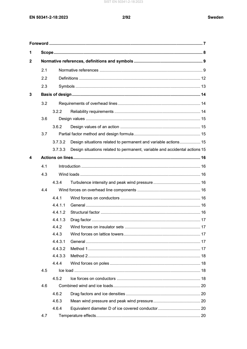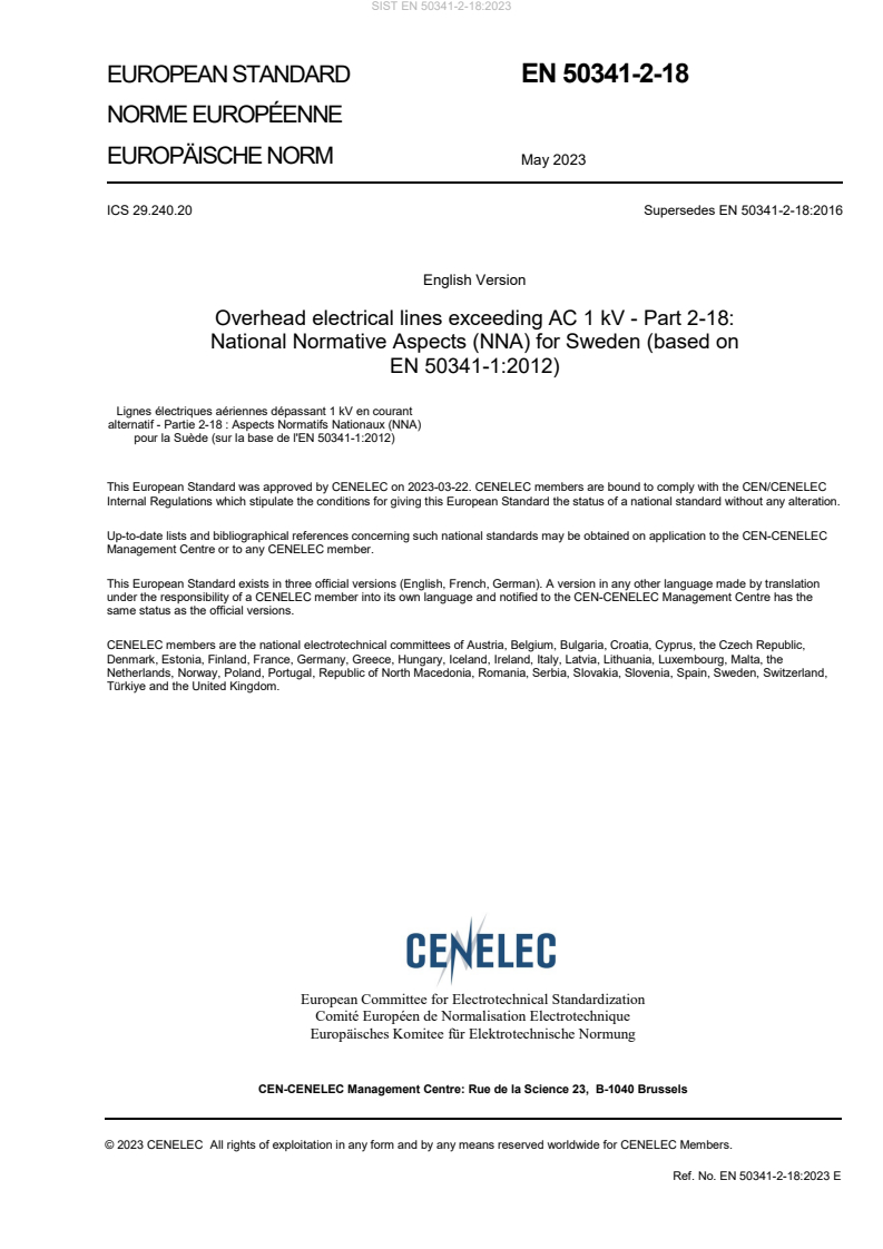 EN 50341-2-18:2023 is a standard published by CLC. Its full title is "Overhead electrical lines exceeding AC 1 kV - Part 2-18: National Normative Aspects (NNA) for Sweden (based on EN 50341-1:2012)". This standard covers: SE.1 Application to existing overhead lines This Part 2-18 is applicable for new overhead lines only and not for existing lines. (A-dev) SE.2 Maintenance, rebuilding or extension of an overhead line Measures related to maintenance of the electrical installation shall fulfill the legislation in force when it was erected. In the case of a rebuilding or extension of an electrical installation (overhead line), the current regulations in force shall be applied for the rebuilding or extension. (Regulations and general advice of the National Electrical Safety Board regarding the installation of electrical installations ”Elsäkerhetsverkets föreskrifter och allmänna råd om hur starkströmsanläggningar ska vara utförda”, Ikraftträdande och övergångsbestämmelser (ELSÄK-FS 2022:1)) (ncpt) SE.3 Optical ground wire (OPGW) and optical phase conductor (OPCON) This Part 2-18 is applicable for installation of OPGW and OPCON, also known as OPPC, in overhead lines in Sweden. (ncpt) SE.4 All dielectric self supporting optical cable (ADSS) and optical attached cable (OPAC) This Part 2-18 is applicable for installation of ADSS and OPAC in overhead lines in Sweden. NOTE The allowable electrical field for the ADSS cable should be taken into consideration when the conductor configuration is determined. SIST EN 50341-2-18:2023