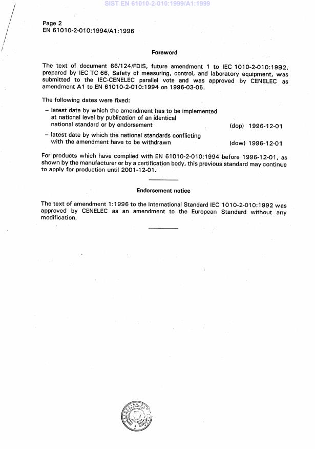 Safety requirements for electrical equipment for measurement, control and laboratory use -- Part 2-010: Particular requirements for laboratory equipment for the heating of materials - Amendment A1 (IEC 61010-2-010:1992/A1:1996)