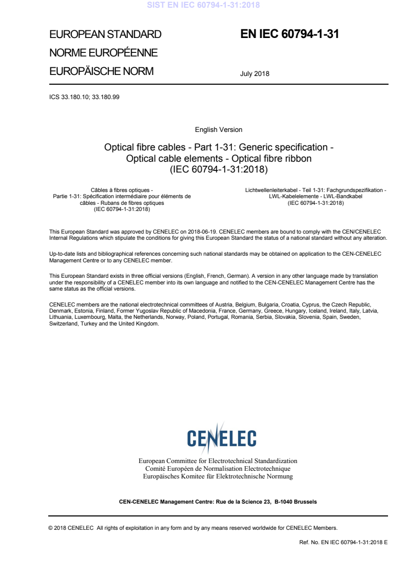 Lichtwellenleiterkabel - Teil 1-31: Fachgrundspezifikation - LWL-Kabelelemente - LWL-Bandkabel (IEC 60794-1-31:2018) This European Standard was approved by CENELEC on 2018-06-19. CENELEC members are bound to comply with the CEN/CENELEC Internal Regulations which stipulate the conditions for giving this European Standard the status of a national standard without any alteration. Up-to-date lists and bibliographical references concerning such national standards may be obtained on application to the CEN-CENELEC Management Centre or to any CENELEC member.