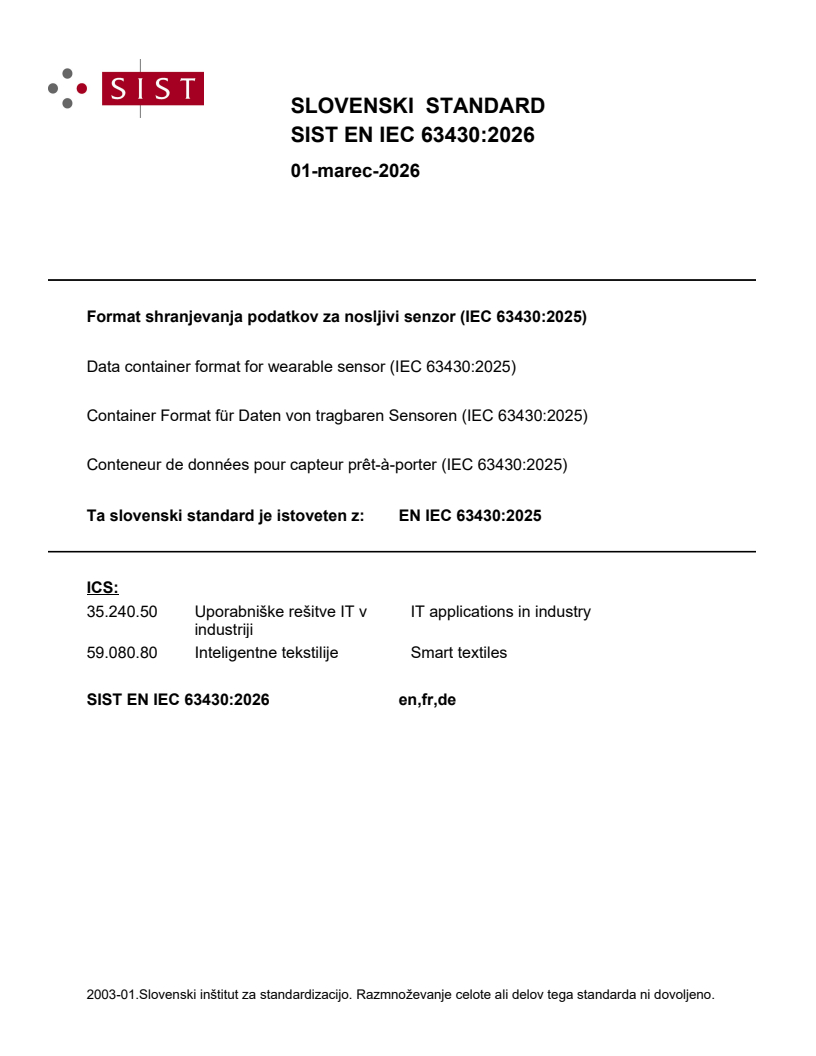 Keywords: EN IEC 63430:2025, data container format, wearable sensor, Schema Repository, edge computing, sensor data, IoT, container header, interoperability, security requirements.