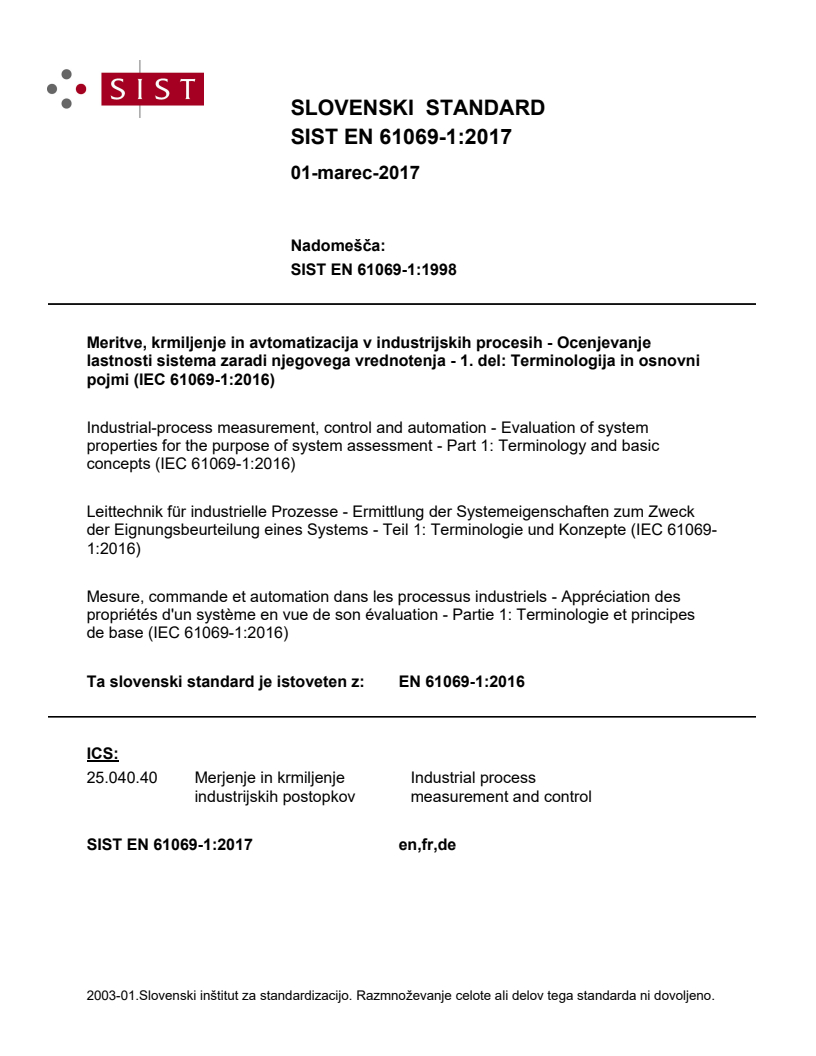 Meritve, krmiljenje in avtomatizacija v industrijskih procesih - Ocenjevanje lastnosti sistema zaradi njegovega vrednotenja - 1. del: Terminologija in osnovni pojmi (IEC 61069-1:2016)