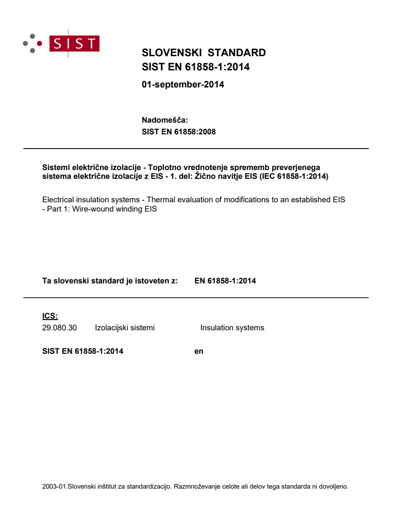 Standard EN IEC 61858-1 navaja seznam zahtevanih preskusnih postopkov za kvalificiranje sprememb preverjenega sistema električne izolacije (EIS) z upoštevanjem njegove toplotne klasifikacije. Ta standard se uporablja za EIS, ki se uporablja v elektrotehničnih napravah z žičnim navitjem. Preskusni postopki so primerjalni do te mere, da se delovanje kandidatnega EIS primerja z delovanjem referenčnega EIS, ki ima dokazane izkušnje pri uporabi v skladu s standardom IEC 60505 ali je bil ovrednoten z enim od postopkov, določenim v skupini standardov IEC 61857.