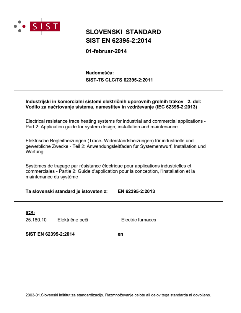 Industrijski in komercialni sistemi električnih uporovnih grelnih trakov - 2. del: Vodilo za načrtovanje sistema, namestitev in vzdrževanje (IEC 62395-2:2013)