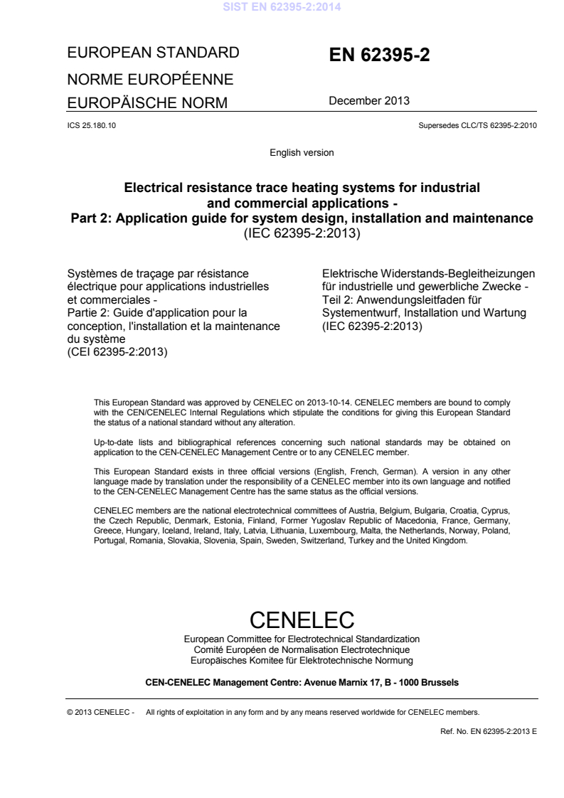 EN 62395-2:2013 (IEC 62395-2:2013) is the CLC/CENELEC European standard Part 2 application guide for electrical resistance trace heating systems used in industrial and commercial applications. It provides practical recommendations for system design, installation, commissioning, maintenance and repair for factory-constructed or field-assembled trace heating including series and parallel heater cables, heater pads and heater panels intended for connection to supplies up to 450 V/750 V. EN 62395-2 complements EN/IEC 62395-1 (general and testing requirements) by focusing on application-specific guidance and safe practice.