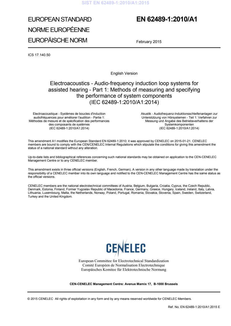 EN 62489-1:2010/A1:2015 (CENELEC adoption of IEC 62489-1:2010/A1:2014) is a European electroacoustics standard for audio-frequency induction loop systems (AFILS) used for assisted hearing. It defines methods of measuring and specifying the performance of system components - amplifiers, loops, neck loops, monitoring devices, and portable receivers - and adds technical requirements introduced by Amendment A1 (2015), including new clauses and annexes for neck loops, monitoring, and test jigs.