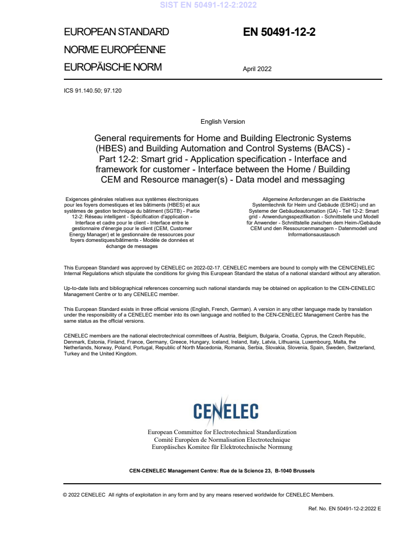 EN 50491-12-2:2022 defines a technology‑neutral data model and messaging framework for semantic interoperability on the S2 interface between a Customer Energy Manager (CEM) and on‑premises Resource Manager(s). It is part of the HBES/BACS (Home and Building Electronic Systems / Building Automation and Control Systems) smart‑grid application specifications and provides the building blocks needed to enable energy management applications inside homes and buildings without prescribing concrete encodings or transport protocols.