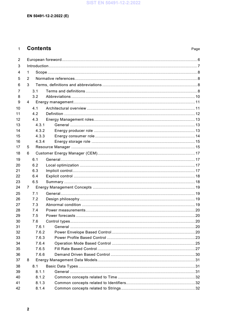 EN 50491-12-2:2022 is a standard published by CLC. Its full title is "General requirements for Home and Building Electronic Systems (HBES) and Building Automation and Control Systems (BACS) - Part 12-2: Smart grid - Application specification - Interface and framework for customer - Interface between the Home / Building CEM and Resource manager(s) - Data model and messaging". This standard covers: This document specifies the fundamental aspects of semantic interoperability for the S2 interface and the related data exchange between a CEM and the Resource Managers within the premises. It provides a technology independent set of data models and interaction patterns in order to enable applications for Energy Management within the premises. This document does not include: — mappings to concrete data representations (XML, JSON and similar); — mappings to application protocols for the message passing; — security related aspects.