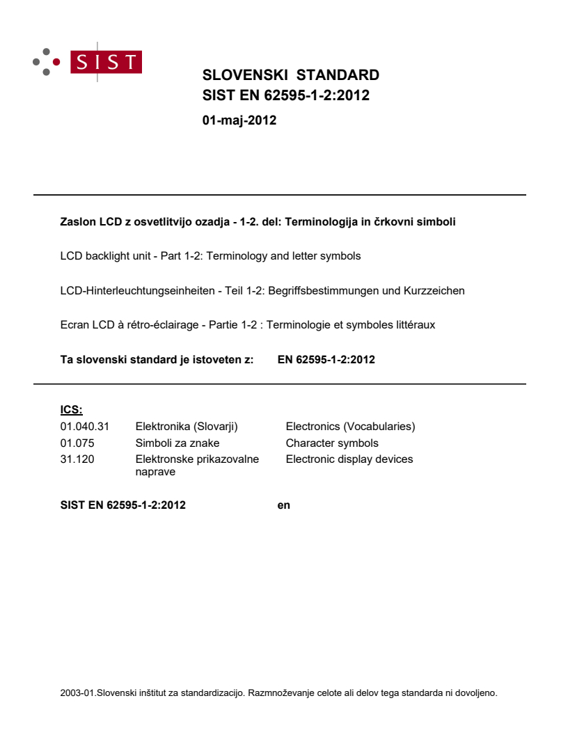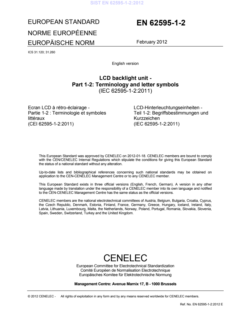 EN 62595-1-2:2012 is a standard published by CLC. Its full title is "LCD backlight unit - Part 1-2: Terminology and letter symbols". This standard covers: IEC 62595-1-2:2011 gives preferred terms, their definitions and symbols for backlight unit (BLU) and related display panel lighting systems including frontlight; with the object of using the same terminology when publications are prepared in different countries.