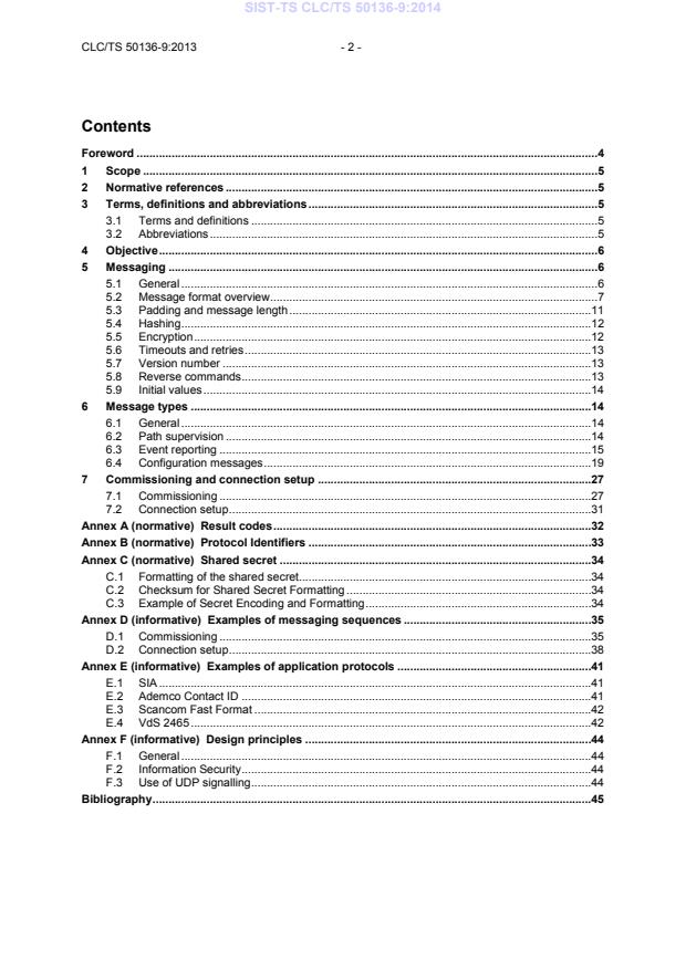 Ta tehnična specifikacija opredeljuje protokol za prenos alarmov in okvar od točke do točke, kot tudi nadzor komunikacije, med oddajno-sprejemno napravo v nadzorovanih prostorih in oddajno-sprejemno napravo v sprejemnem središču z uporabo internetnega protokola (IP). Protokol je namenjen za uporabo prek katerega koli omrežja, ki podpira prenos podatkov internetnega protokola. To vključuje ethernet, xDSL, GPRS, WiFi, UMTS in WIMAX. Lastnosti delovanja sistema za prenos alarma so navedene v standardu EN 50136-1. Lastnosti delovanja opreme na varovanem območju morajo izpolnjevati vse zahteve standardov povezanih alarmnih sistemov in veljajo za prenos vseh vrst alarmov, vključno s, a ne omejeno na, požarnimi in vlomnimi alarmi, alarmi za nadzor dostopa in družbenimi alarmi. Skladnost s to tehnično specifikacijo je izbirna.