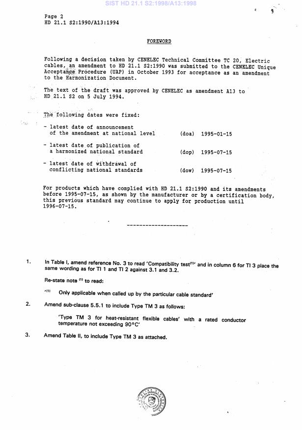 HD 21.1 S2:1990/A13:1994 is a standardization document published by CLC. Its full title is "Polyvinyl chloride insulated cables of rated voltages up to and including 450/750 V - Part 1: General requirements". This standard covers: Superseded by HD 21.1 S3:1997
