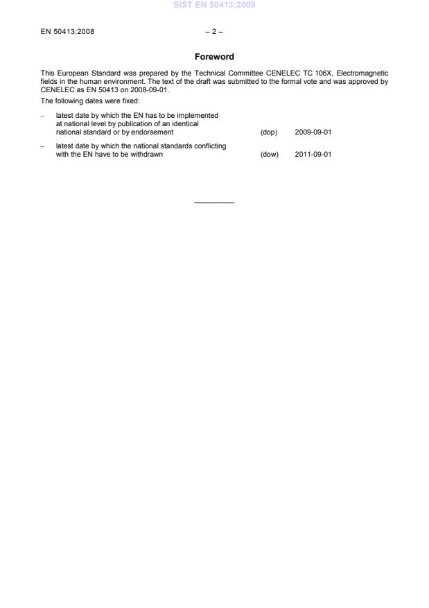 0iatddttTcSAR= where Ei r.m.s. value of the electric field strength in the tissue in V/m; 1 conductivity of body tissue in S/m; ρ density of body tissue in kg/m3; ci heat capacity of body tissue in J/kg K; dT / dt time derivative of temperature in body tissue in K/s. 3.29 unperturbed field field that exists in a space in the absence of a person or an object that could influence the field NOTE The field measured or calculated with a person or object present may differ considerably 4 Introduction 4.1 General remarks Electric, magnetic and electromagnetic fields can have direct and indirect effects on the human body. Depending on the frequency of the fields these effects can be stimulation of central nervous system in the low frequency range and thermal effects in the high frequency range. Besides these direct effects there exist several indirect effects such as the occurrence of contact currents or the possible influence on the intended operation of active medical implants. Also the type (continuous wave, pulsed, single/multi-frequency, low/high frequency range), the distribution (single/multiple sources) and the localisation (whole body, head and trunk, limbs) of the electric, magnetic and electromagnetic fields greatly influence the basic concepts or principles that can be used and the field quantities which have to be assessed. Special attention should be paid to the rationale and to the special requirements of the protection guidelines which are used for exposure assessment. SIST EN 50413:2009