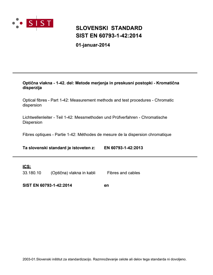 Keywords: chromatic dispersion of optical fibre, EN 60793-1-42:2013, IEC 60793-1-42, measurement methods, optical fibre dispersion.