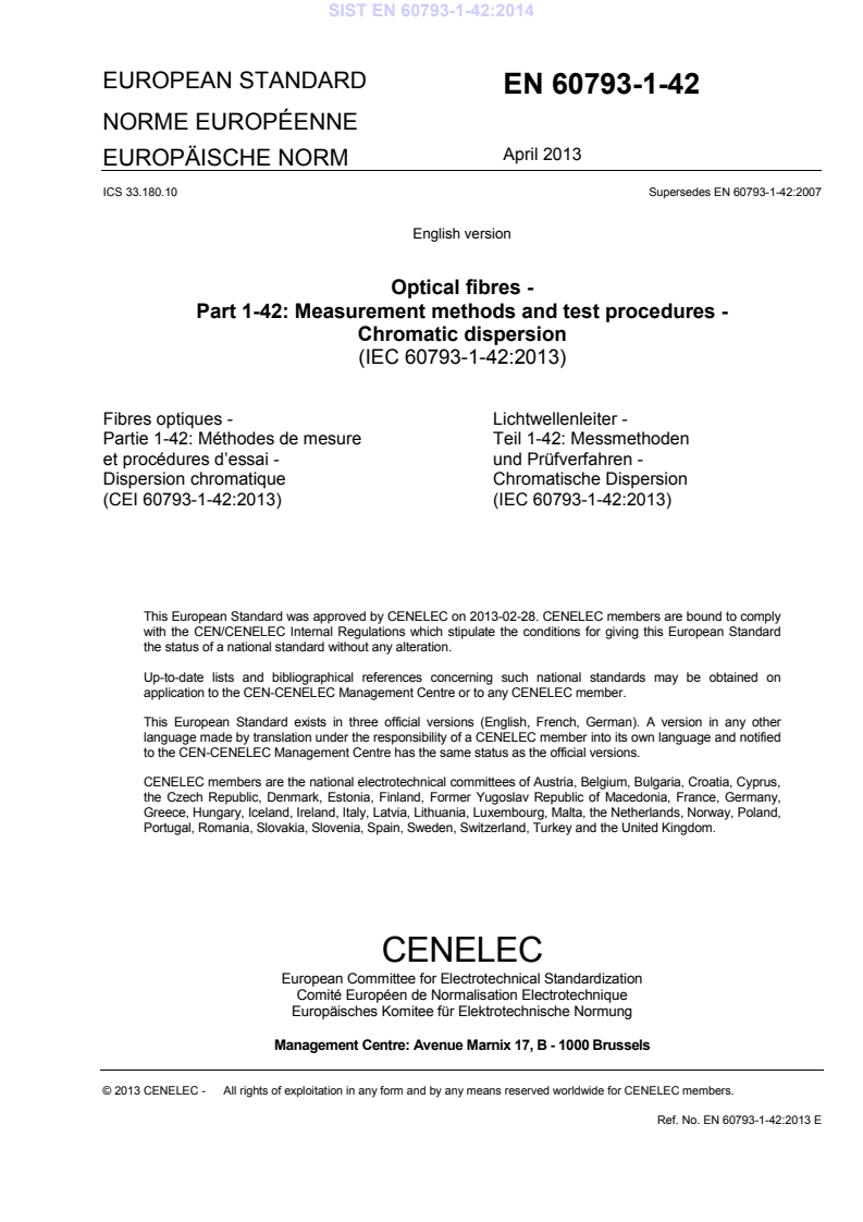 EN 60793-1-42:2013 (IEC 60793-1-42:2013) defines uniform measurement methods and test procedures for the chromatic dispersion of optical fibre. This third edition updates the 2007 version and is intended to support commercial inspection, product specification and acceptance testing of fibres and cables. The standard describes how to obtain group delay versus wavelength, derive chromatic dispersion and dispersion slope, and how to report results for different fibre categories.