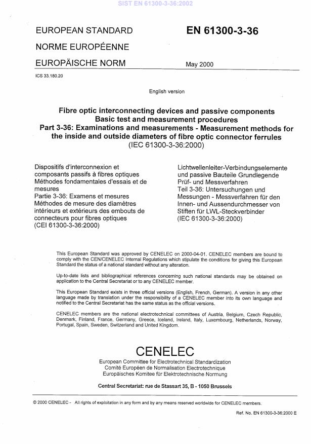 EN 61300-3-36:2000 is a standard published by CLC. Its full title is "Fibre optic interconnecting devices and passive components - Basic test and measurement procedures - Part 3-36: Examinations and measurements - Measurement methods for the inside and outside diameters of fibre optic connector ferrules". This standard covers: Describes the measurement methods of the inside diameter of fibre optic connector ferrules.