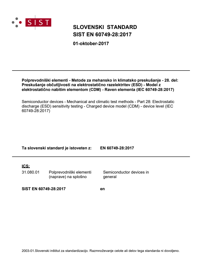 2003-01.Slovenski inštitut za standardizacijo. Razmnoževanje celote ali delov tega standarda ni dovoljeno.Semiconductor devices - Mechanical and climatic test methods - Part 28: Electrostatic discharge (ESD) sensitivity testing - Charged device model (CDM) - device level (IEC 60749-28:2017)31.080.01Polprevodniški elementi (naprave) na splošnoSemiconductor devices in generalICS:Ta slovenski standard je istoveten z:EN 60749-28:2017SIST EN 60749-28:2017en01-oktober-2017SIST EN 60749-28:2017SLOVENSKI