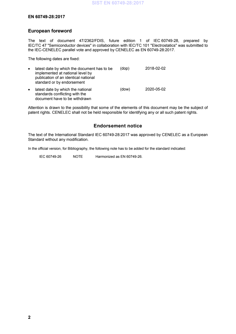 Endorsement notice The text of the International Standard IEC 60749-28:2017 was approved by CENELEC as a European Standard without any modification. In the official version, for Bibliography, the following note has to be added for the standard indicated: