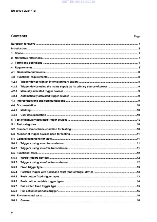 EN 50134-2:2017 is a standard published by CLC. Its full title is "Alarm systems - Social alarm systems - Part 2: Trigger devices". This standard covers: This European Standard specifies the requirements for manually and automatically activated trigger devices transmitting a triggering signal. This European Standard specifies the requirements and tests for trigger devices forming part of a social alarm system. This European Standard applies to all trigger devices that transmit a triggering signal to a local unit or controller using wired or wire-free interconnections methods.