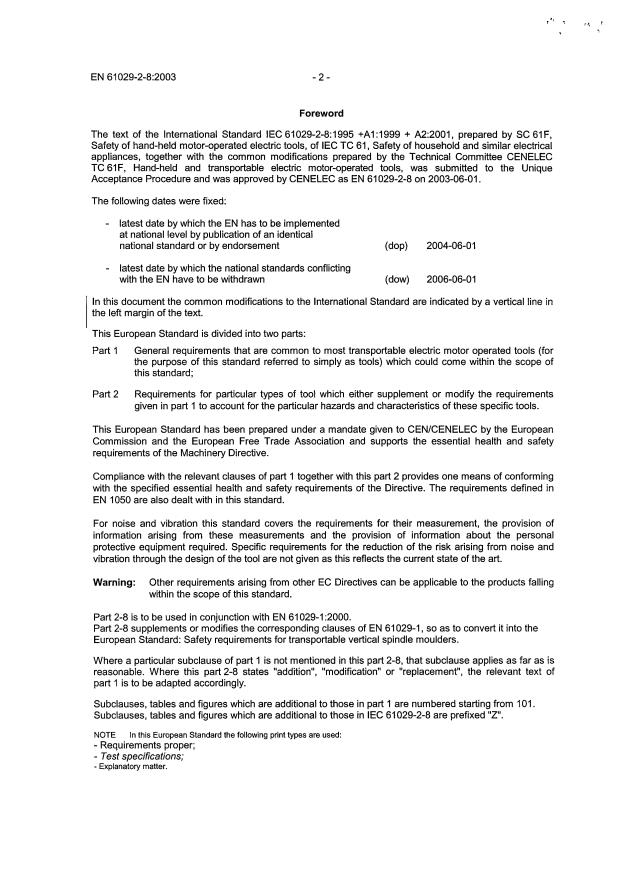 EN 61029-2-8:2003 is a standard published by CLC. Its full title is "Safety of transportable motor-operated electric tools - Part 2-8: Particular requirements for single spindle vertical moulders". This standard covers: Applies to transportable single spindle vertical moulders with a maximum cutter block diameter of 180 mm.