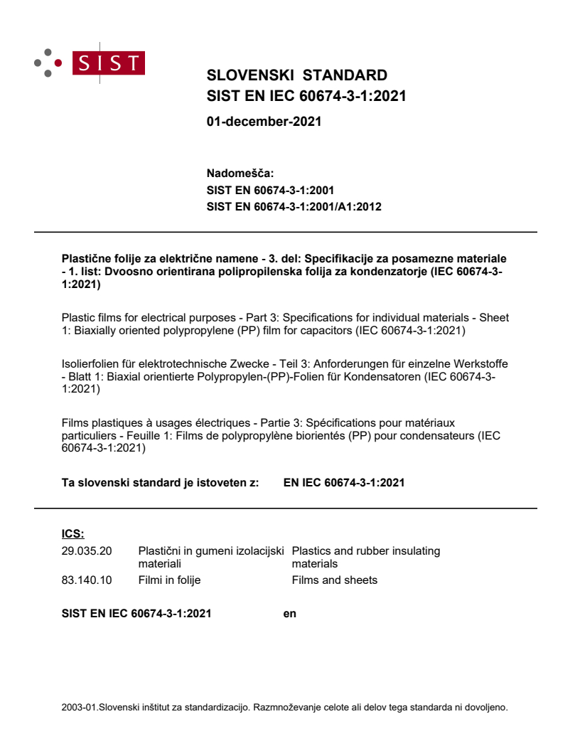 - 1. list: Dvoosno orientirana polipropilenska folija za kondenzatorje (IEC 60674-3-