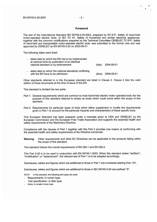 EN 60745-2-20:2003 is associated with the following European legislation: EU Directives/Regulations: 98/37/EC; Standardization Mandates: M/083. When a standard is cited in the Official Journal of the European Union, products manufactured in conformity with it benefit from a presumption of conformity with the essential requirements of the corresponding EU directive or regulation.