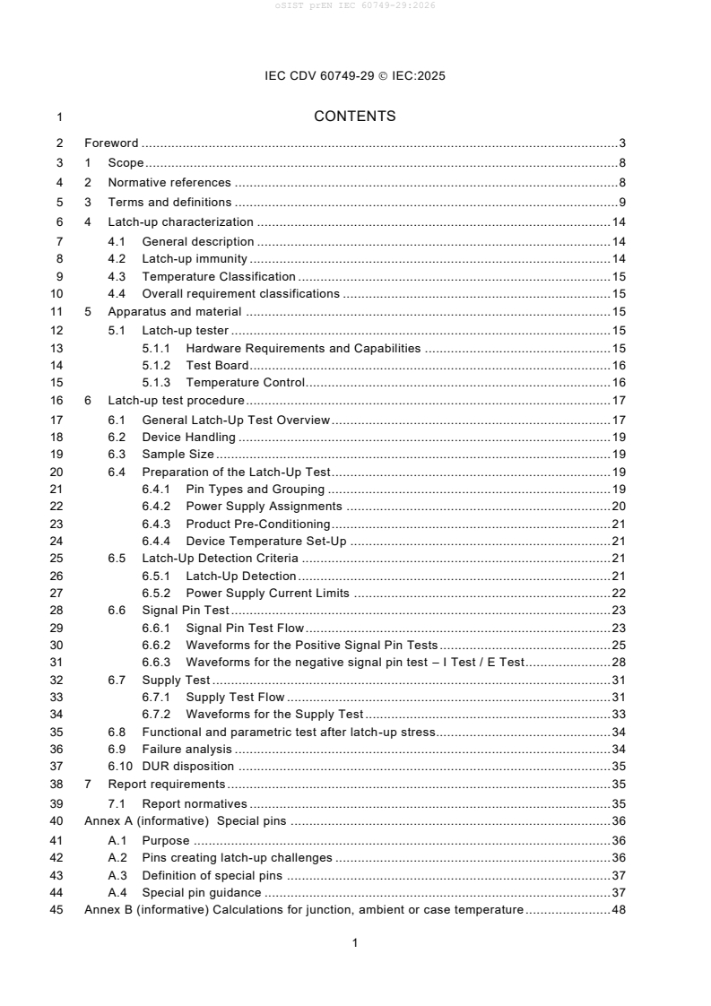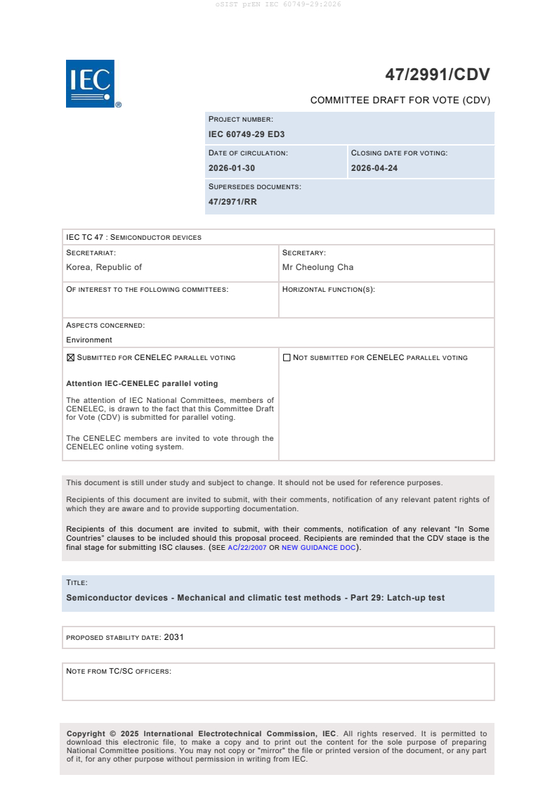 prEN IEC 60749-29:2026 – Semiconductor devices - Mechanical and climatic test methods - Part 29: Latch-up test – is a forthcoming international standard developed by IEC Technical Committee 47 (Semiconductor devices) and adopted by CENELEC (CLC). This standard specifies methods for latch-up testing of semiconductor devices such as integrated circuits (ICs), thin-film circuits, SAW devices, optoelectronic devices, hybrid integrated circuits (HICs), and multi-chip modules (MCMs). Latch-up testing helps manufacturers and users evaluate, classify, and improve the immunity of semiconductor products to latch-up failure, ensuring device quality and long-term operational reliability.