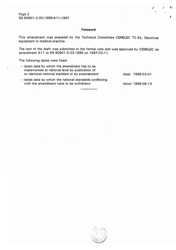 EN 60601-2-33:1995/A11:1997 is a amendment published by CLC. Its full title is "Medical electrical equipment - Part 2: Particular requirements for the safety of magnetic resonance equipment for medical diagnosis". This standard covers: Superseded by EN 60601-2-33:2002