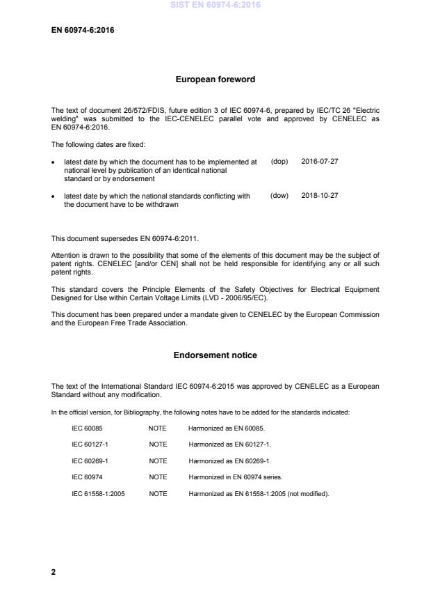 This document supersedes EN 60974-6:2011. Attention is drawn to the possibility that some of the elements of this document may be the subject of patent rights. CENELEC [and/or CEN] shall not be held responsible for identifying any or all such patent rights. This standard covers the Principle Elements of the Safety Objectives for Electrical Equipment Designed for Use within Certain Voltage Limits (LVD - 2006/95/EC). This document has been prepared under a mandate given to CENELEC by the European Commission and the European Free Trade Association. Endorsement notice The text of the International Standard IEC 60974-6:2015 was approved by CENELEC as a European Standard without any modification. In the official version, for Bibliography, the following notes have to be added for the standards indicated: IEC 60085 NOTE Harmonized as EN 60085. IEC 60127-1 NOTE Harmonized as EN 60127-1. IEC 60269-1 NOTE Harmonized as EN 60269-1. IEC 60974 NOTE Harmonized in EN 60974 series. IEC 61558-1:2005 NOTE Harmonized as EN 61558-1:2005 (not modified). SIST EN 60974-6:2016