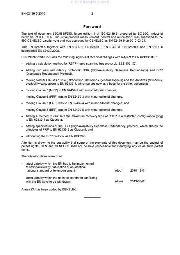 – moving Clause 5 (MRP) to IEC 62439-2 with minor editorial changes, SIST EN 62439-5:2010