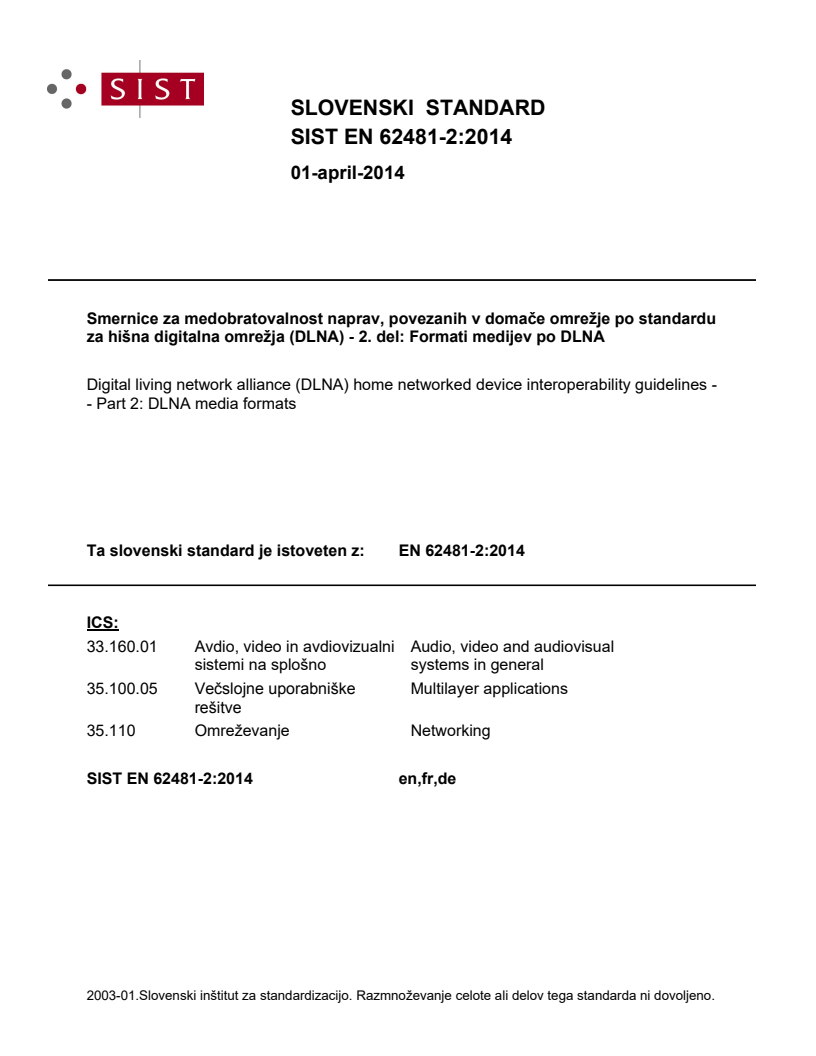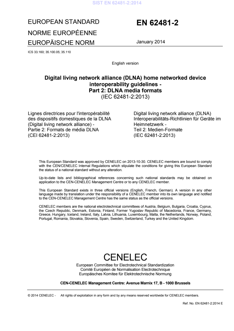 EN 62481-2:2014 is a standard published by CLC. Its full title is "Digital living network alliance (DLNA) home networked device interoperability guidelines - Part 2: DLNA media formats". This standard covers: IEC 62481-2:2013(E) describes DLNA Media Format Profiles applicable to the DLNA Device Classes defined in IEC 62481-1. Media Format Profiles are defined for each of the following media classes: Audio, Image, and AV. In addition, Profile ID values that identify media collections and printer XHTML documents are also introduced. This second edition cancels and replaces the first edition published in 2007, and constitutes a technical revision. It includes the following changes: - addition of new optional media format profiles for Audio and AV content; - addition of mandatory media format profiles for the CVP-1 Device Profile; - includes updates to resolve interoperability issues. A bilingual version of this publication may be issued at a later date.