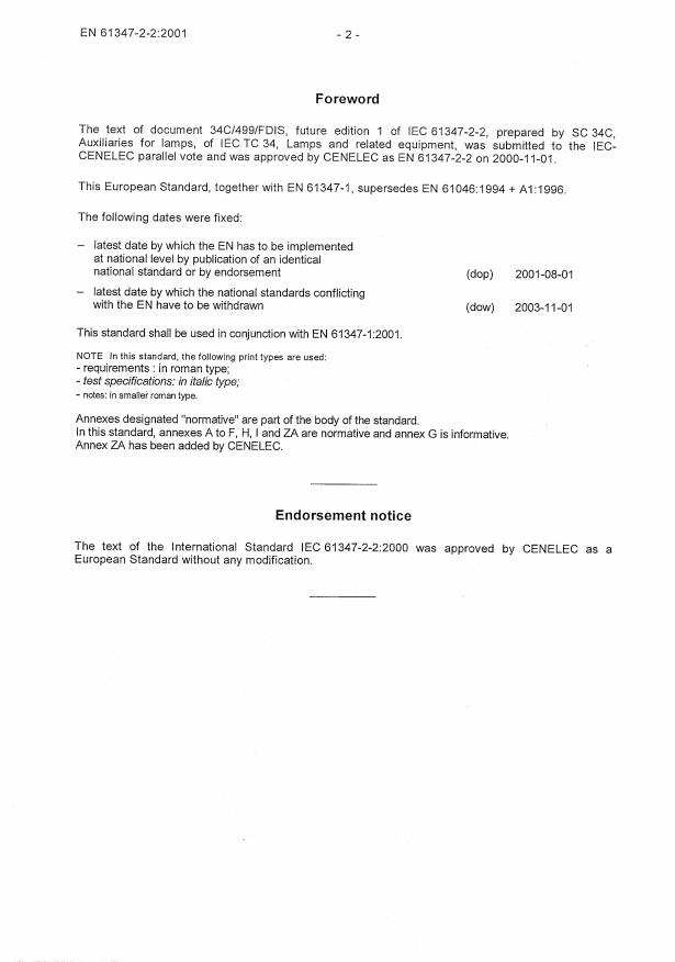 EN 61347-2-2:2001 is associated with the following European legislation: EU Directives/Regulations: 2006/95/EC, 73/23/EEC. When a standard is cited in the Official Journal of the European Union, products manufactured in conformity with it benefit from a presumption of conformity with the essential requirements of the corresponding EU directive or regulation.