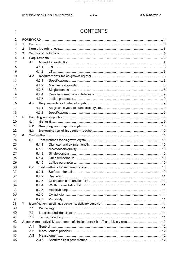 IEC 63541:2025 applies to lithium tantalate (LT) and lithium niobate (LN) crystals for surface acoustic wave devices, including the as-grown crystals and lumbered crystals.