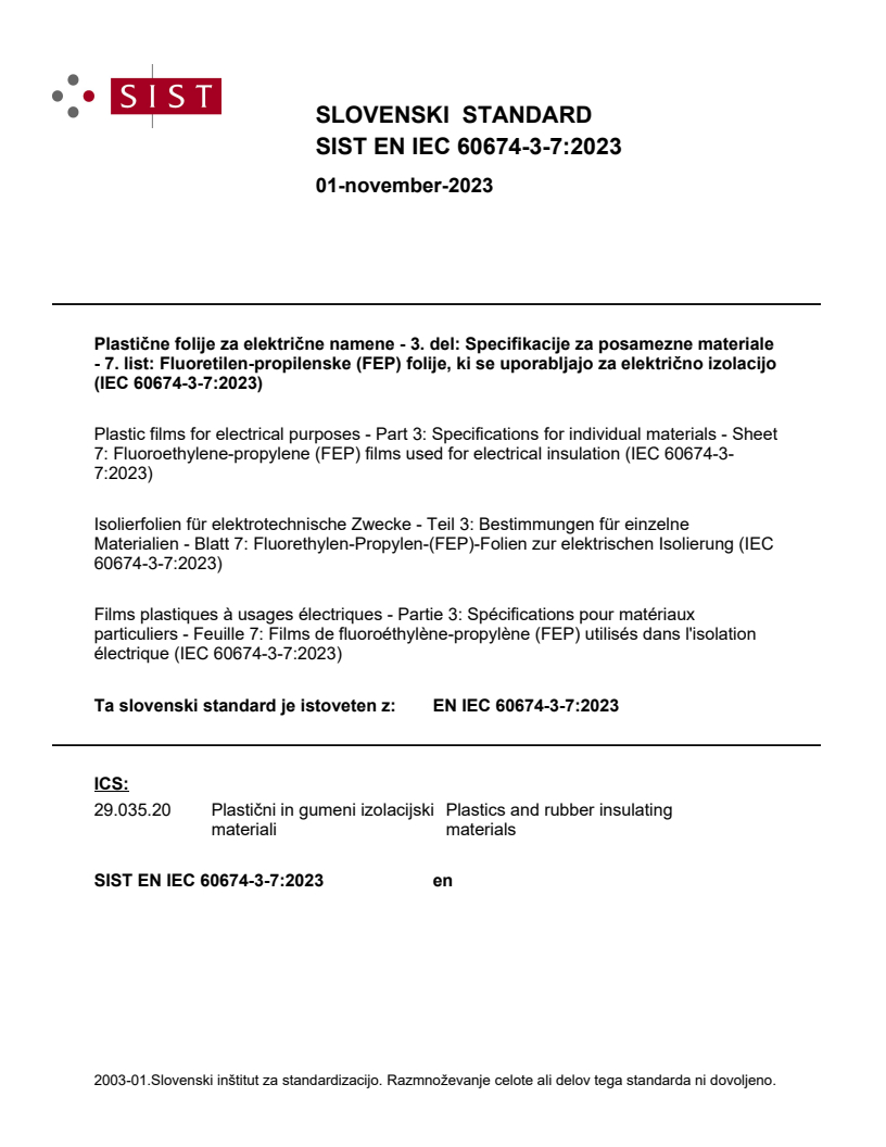 Ta list standarda IEC 60674-3 določa zahteve za fluoretilen-propilenske (FEP) folije, ki se uporabljajo za električno izolacijo.
