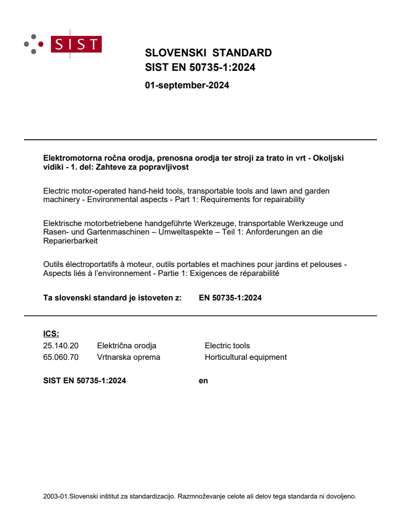 EN 50735-1:2024 is a standard published by CLC. Its full title is "Electric motor-operated hand-held tools, transportable tools and lawn and garden machinery - Environmental aspects - Part 1: Requirements for repairability". This standard covers: This document provides product group specific guidance for a common understanding of measures, given by any legislation, to define product specific information on the repairability and the reuse of used parts of motor-operated hand-held tools, transportable tools, lawn and garden machinery. It is based on the following aspects: - the inherent technical possibility/features to repair a product; - the ability of the person repairing the product (skill level and tools); - the possibility to reuse used parts of a product; - the ability during repair for software updates. The decision whether a product should be repaired is dependent on a range of factors such as health and safety, intended use as well as economic, legal, and environmental aspects. However, the question of whether it is reasonable to repair the product or reuse of used parts is outside of the scope of this document. This document does not cover software (firmware and application software) or hardware modifications that change the intended use of the product. Other risks making products non-compliant with safety standards are also not covered by this document. The safety of the repairer during the repair is out of scope of this document.