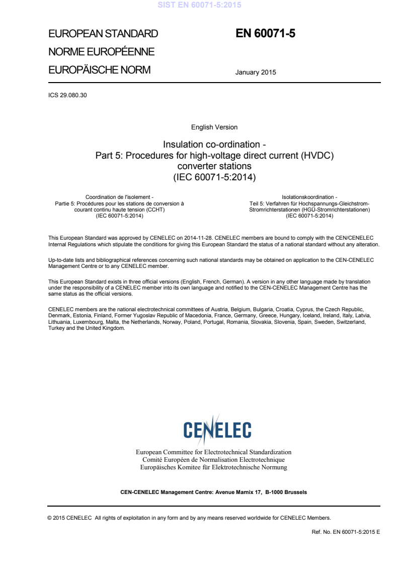 EN 60071-5:2015 is a standard published by CLC. Its full title is "Insulation co-ordination - Part 5: Procedures for high-voltage direct current (HVDC) converter stations". This standard covers: Provides guidance on the procedures for insulation co-ordination of high-voltage direct current (HVDC) converter stations, without prescribing standardized insulation levels. Applies only for HVDC applications in high-voltage a.c. power systems and not for industrial conversion equipment. Principles and guidance given are for insulation co-ordination purposes only. The requirements for human safety are not covered.