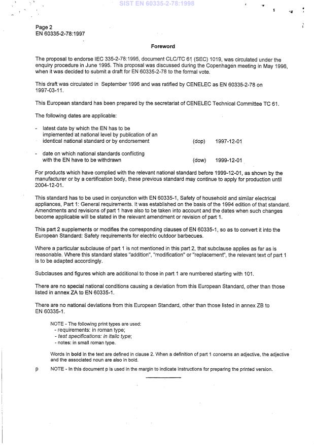EN 60335-2-78:1997 is a standard published by CLC. Its full title is "Safety of household and similar electrical appliances - Part 2-78: Particular requirements for outdoor barbecues". This standard covers: Deals with the safety of outdoor barbecues for household and similar use, their rated voltage being not more than 250 V.