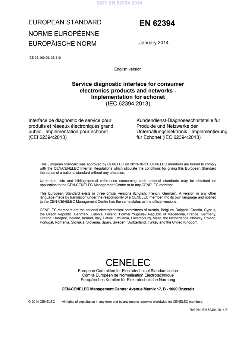 EN 62394:2014 is a standard published by CLC. Its full title is "Service diagnostic interface for consumer electronics products and networks - Implementation for echonet". This standard covers: IEC 62394:2013 specifies requirements for service diagnostic software to be implemented in products that incorporate a digital interface. It does not specify requirements for carrying out remote diagnosis or for manufacturer-dependent software. It is based upon the ECHONET specification version 2.11, ECHONET Lite specification version 1.01 and APPENDIX Detailed Requirements for ECHONET Device objects Release B because this interface will be used in future products. The use of this connection and existing communication protocols enable implementation in products at low cost, with maximum flexibility and efficiency. This second edition cancels and replaces the first edition, published in 2006, and constitutes a technical revision. It includes the following changes: - addition of new message structure (frame format); - updates of the device object super class specifications for the property configurations shared by all device objects; - addition of the property configurations defined by each device object; - updates of normative references.