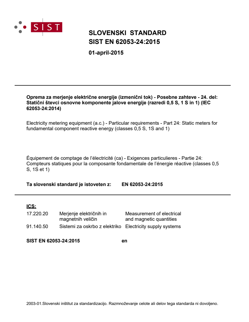 2003-01.Slovenski inštitut za standardizacijo. Razmnoževanje celote ali delov tega standarda ni dovoljeno.Équipement de comptage de l’électricité (ca) - Exigences particulieres - Partie 24: Compteurs statiques pour la composante fondamentale de l’énergie réactive (classes 0,5 S, 1S et 1)Electricity metering equipment (a.c.) - Particular requirements - Part 24: Static meters for fundamental component reactive energy (classes 0,5 S, 1S and 1)91.140.50Sistemi za oskrbo z elektrikoElectricity supply systems17.220.20Measurement of electrical and magnetic quantitiesICS:Ta slovenski standard je istoveten z:EN 62053-24:2015SIST EN 62053-24:2015en01-april-2015SIST EN 62053-24:2015SLOVENSKI