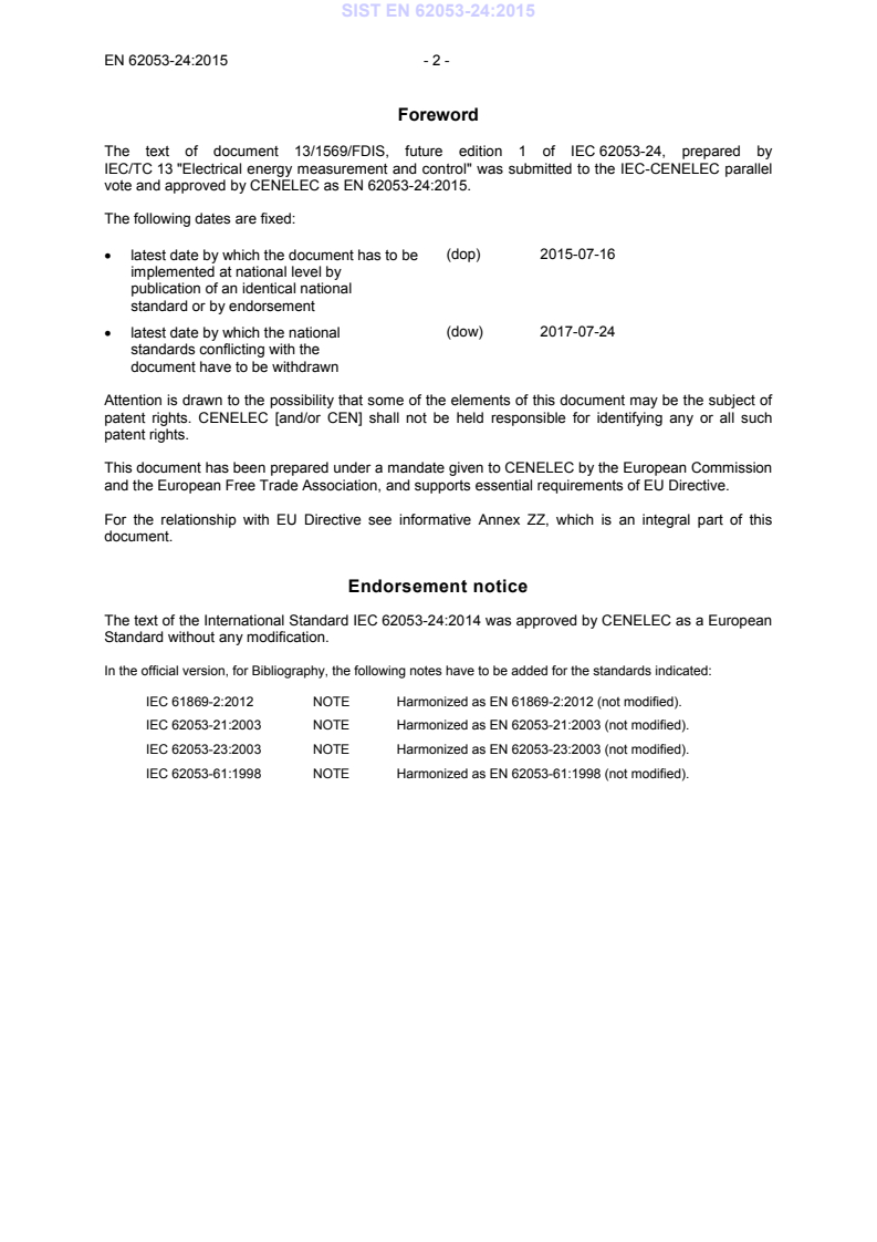Endorsement notice The text of the International Standard IEC 62053-24:2014 was approved by CENELEC as a European Standard without any modification. In the official version, for Bibliography, the following notes have to be added for the standards indicated:
