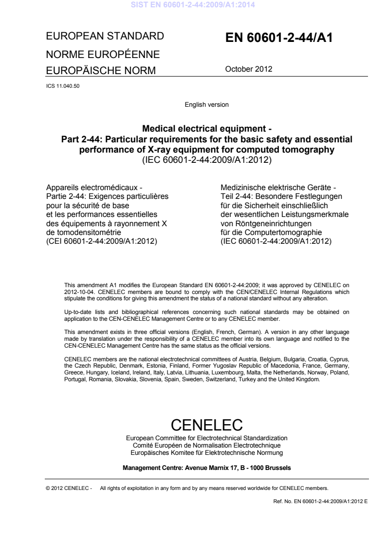 EN 60601-2-44:2009/A1:2012 (adoption of IEC 60601-2-44:2009/A1:2012) is the European particular standard for the basic safety and essential performance of X‑ray equipment for computed tomography (CT). Published by CENELEC/CEN and adopted by national bodies (e.g., SIST), Amendment A1 updates CT dose metrics, user dose notifications, and requirements for CT use in radiotherapy treatment planning (RTP). It supports compliance with EU medical device directives and complements the IEC 60601 family for medical electrical equipment.