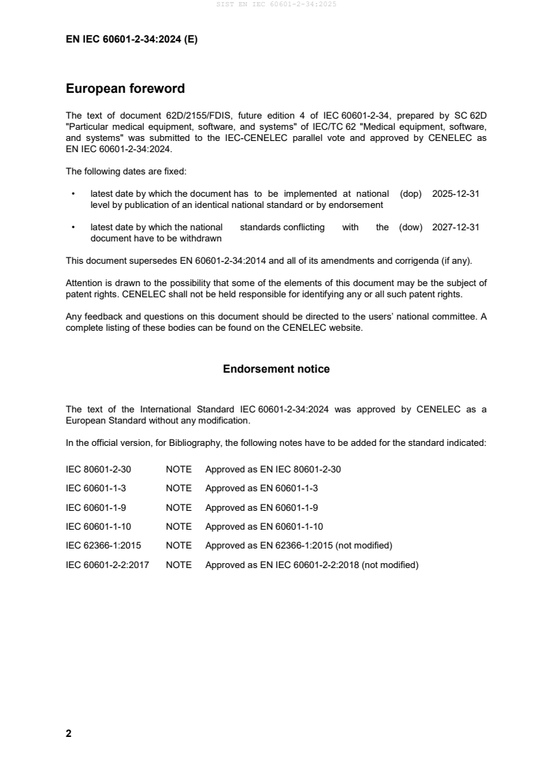 EN IEC 60601-2-34:2024 is a standard published by CLC. Its full title is "Medical electrical equipment - Part 2-34: Particular requirements for the basic safety and essential performance of invasive blood pressure monitoring equipment". This standard covers: IEC 60601-2-34:2024 applies to BASIC SAFETY and ESSENTIAL PERFORMANCE of INVASIVE BLOOD PRESSURE MONITORING EQUIPMENT as defined in 201.3.63, hereinafter also referred to as ME EQUIPMENT. This document applies to INVASIVE BLOOD PRESSURE MONITORING EQUIPMENT intended for use in professional healthcare facilities and in the EMERGENCY MEDICAL SERVICE ENVIRONMENT. This document does not apply to catheter tubing, catheter needles, Luer locks, taps and tap tables that connect to the DOME. This document does not apply to non-invasive blood pressure monitoring equipment. If a clause or subclause is specifically intended to be applicable to ME EQUIPMENT only, or to ME SYSTEMS only, the title and content of that clause or subclause will say so. If that is not the case, the clause or subclause applies both to ME EQUIPMENT and to ME SYSTEMS, as follows: The clause or subclause applies to ME EQUIPMENT, as default and, only if the corresponding safety measure or function is not completely integrated into the ME EQUIPMENT but implemented as part of an ME SYSTEM, the clause or subclause applies to the ME SYSTEM. IEC 60601-2-34:2024 cancels and replaces the third edition of IEC 60601-2-34 published in 2011 and constitutes a technical revision. This edition includes the following significant technical changes with respect to the previous edition: a) revision to align with IEC 60601-1:2005, IEC 60601-1:2005/AMD1:2012 and IEC 60601-1:2005/AMD2:2020, as well as new versions of collateral standards and amendments thereto; b) expansion of the scope to the emergency medical service environment; c) changed essential performance in Table 201.101; d) changed requirement for ingress protection; e) added primary operating functions; f) deleted Annex BB Alarm diagrams.
