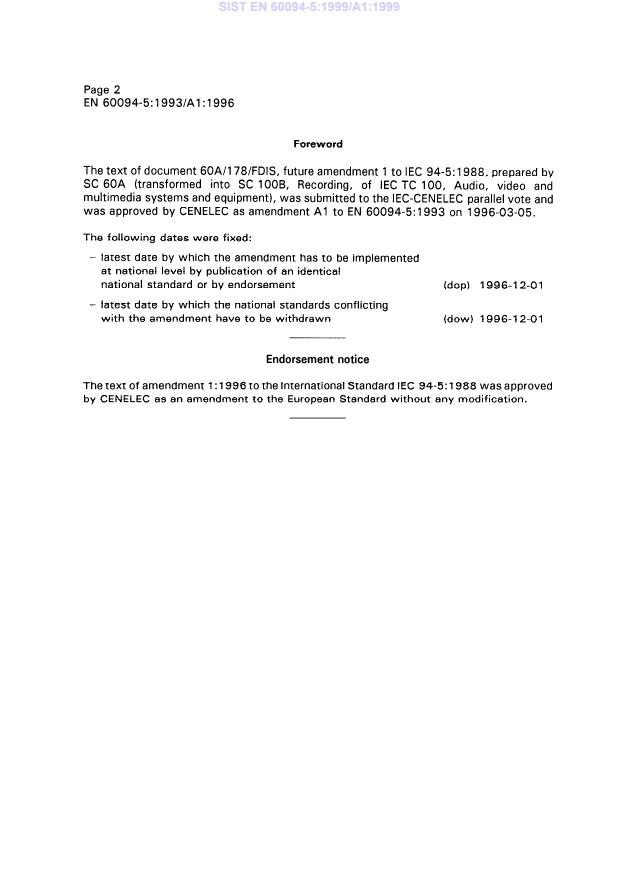 EN 60094-5:1993/A1:1996 is a amendment published by CLC. Its full title is "Magnetic tape sound recording and reproducing systems - Part 5: Electrical magnetic tape properties". This standard covers: EN following parallel vote