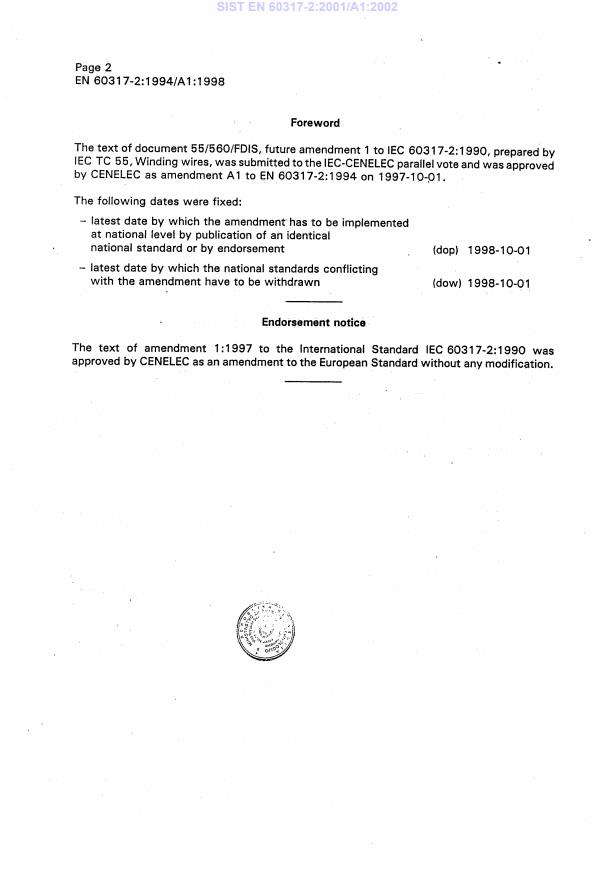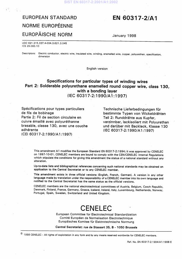 EN 60317-2:1994/A1:1998 is a amendment published by CLC. Its full title is "Specifications for particular types of winding wires - Part 2: Solderable polyurethane enamelled round copper wire, class 130, with a bonding layer". This standard covers: EN following parallel vote * Superseded by EN 60317-2:2012 withdrawn by D145/C012