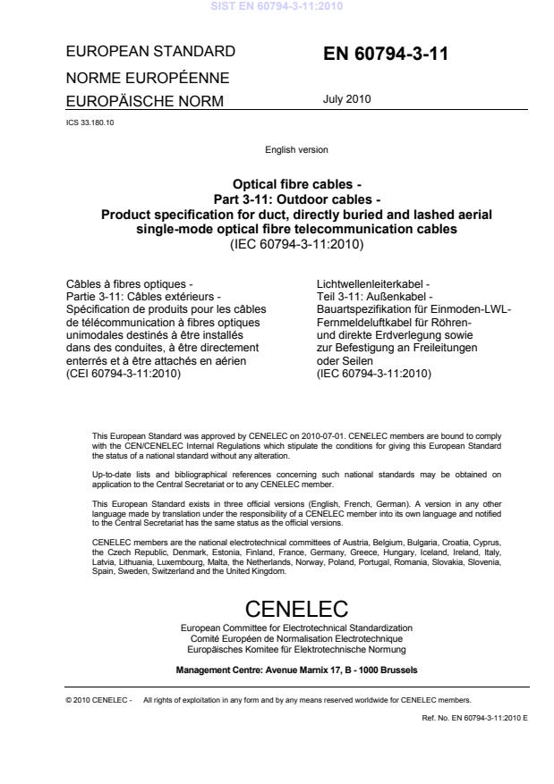 Keywords: EN 60794-3-11:2010, optical fibre cables, single‑mode, duct, direct buried, lashed aerial, product specification, cable testing, outdoor fibre cable.