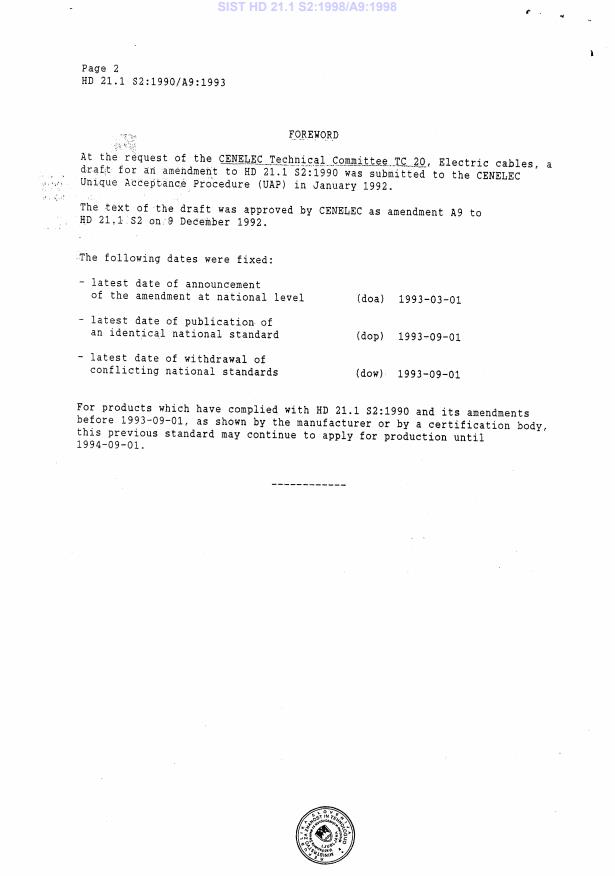 HD 21.1 S2:1990/A9:1993 is a amendment published by CLC. Its full title is "Polyvinyl chloride insulated cables of rated voltages up to and including 450/750 V - Part 1: General requirements". This standard covers: Superseded by HD 21.1 S3:1997